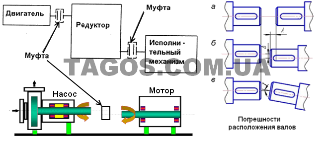 Муфты соединения валов служат для передачи движения между ведущим и ведомым валами. Также муфты позволяют решить проблему несоосностей: горизонтальной (а), вертикальной (б) и угловой (в) погрешностей.