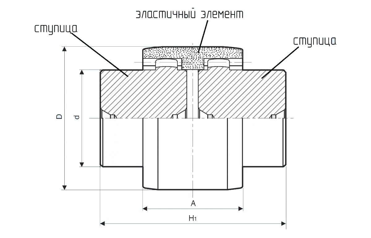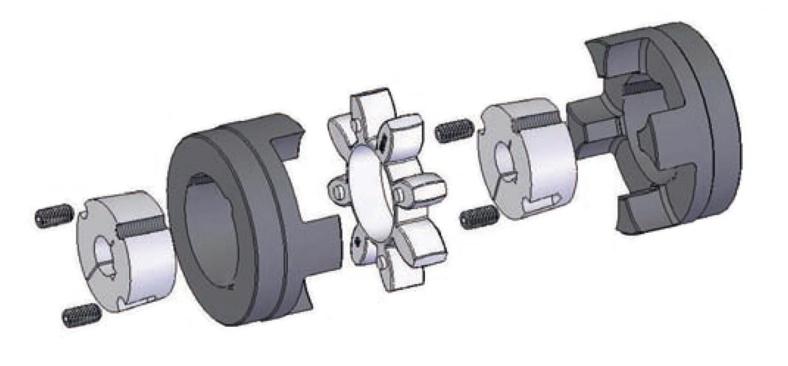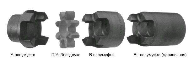 Муфта соединительная состоит: из двух полумуфт и одного упругого эластичного элемента (полиуретановая или резиновая звездочка).
